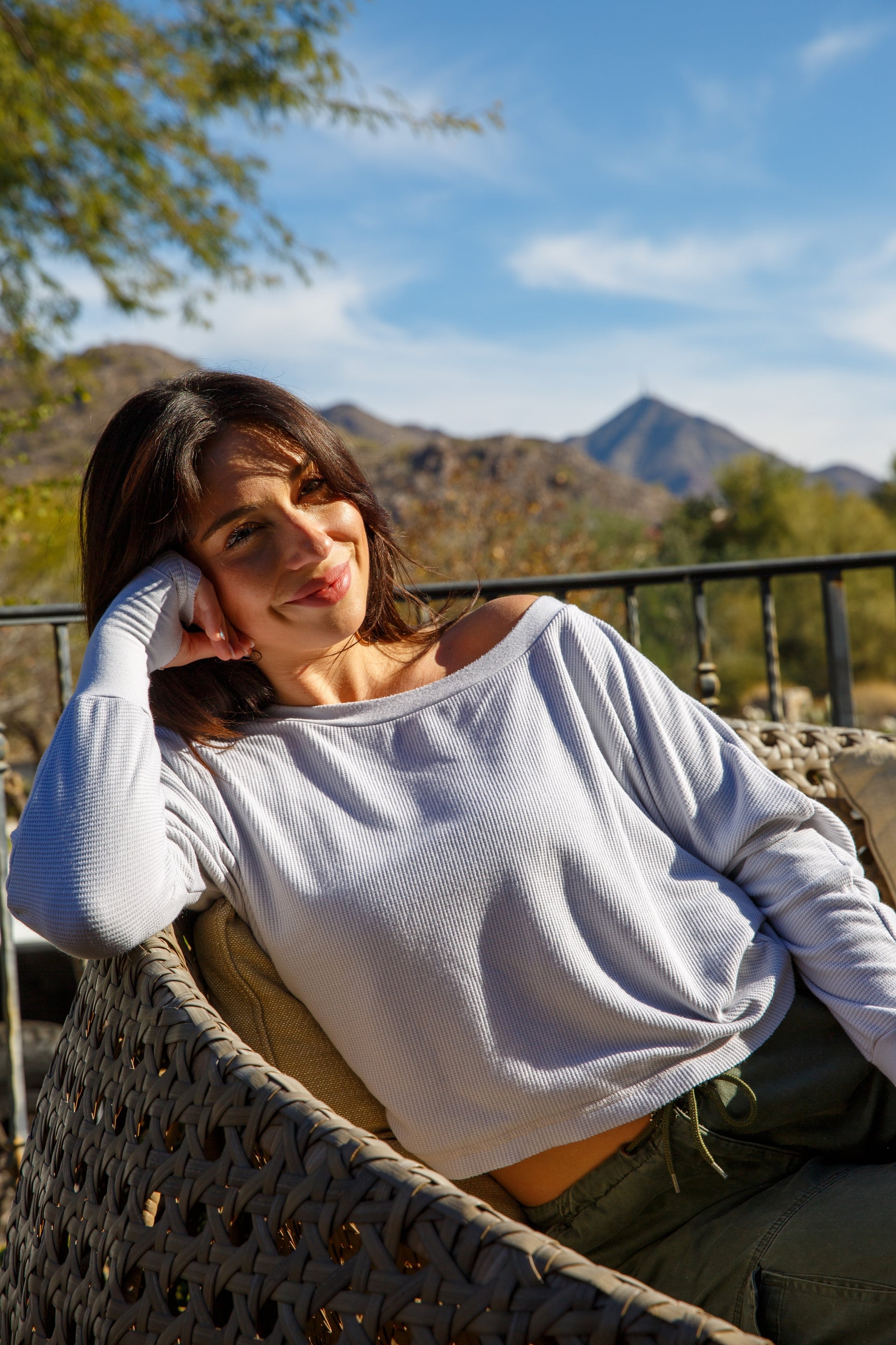 This lined off shoulder thermal sweatshirt adds plenty of cool comfort to your wardrobe. done one with a soft modal lining, and thermal outside, its slightly cropped length falls perfectly over our tie waist pant. With a relaxed silhouette, slightly cropped length, and ribbed cuffs and hem, this style will give you an effortlessly cool look.
